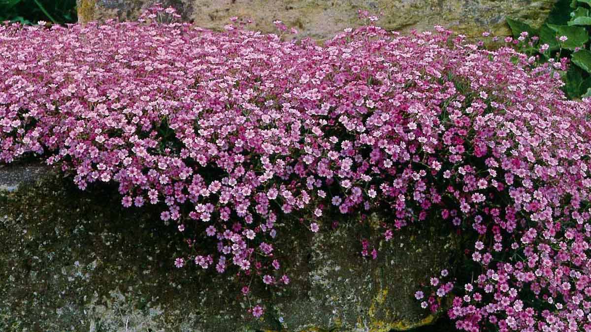 Однолетняя гипсофила ползучая (Gypsophila repens) имеет форму густого кустика высотой 15-20 см. Формирует характерные мелкие цветки – пятилепестковый белый или розовый цветок и метельчатые соцветия. Цветет в июне-сентябре. Растению нравится легкая, песчаная и суглинистая почва, богатая кальцием. Поливать нужно регулярно, в меру.
