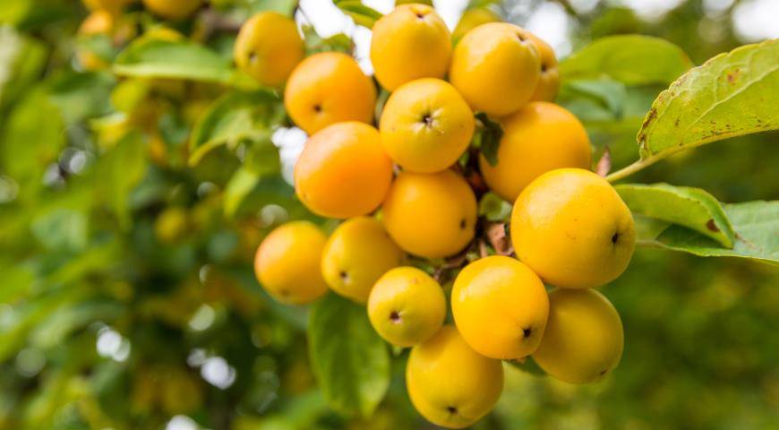 Яблоеня высота 4-6 м, крона округлой формы. Листья глянцевитые, зеленые. Бутоны розовые, цветки в роспуске белые, цветение обильное. Плоды яркого желтого цвета, долго не опадают.
