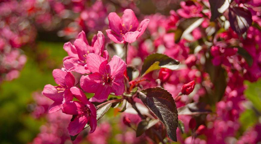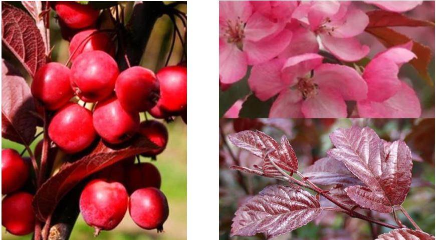 Высота 4-6 м, крона округлая, молодые листья пурпурные, взрослые – зеленые. Очень эфффектны цветки – розово-пурпурные, диаметром до 5 см. Цветение обильное. Плоды красные, мелкие.