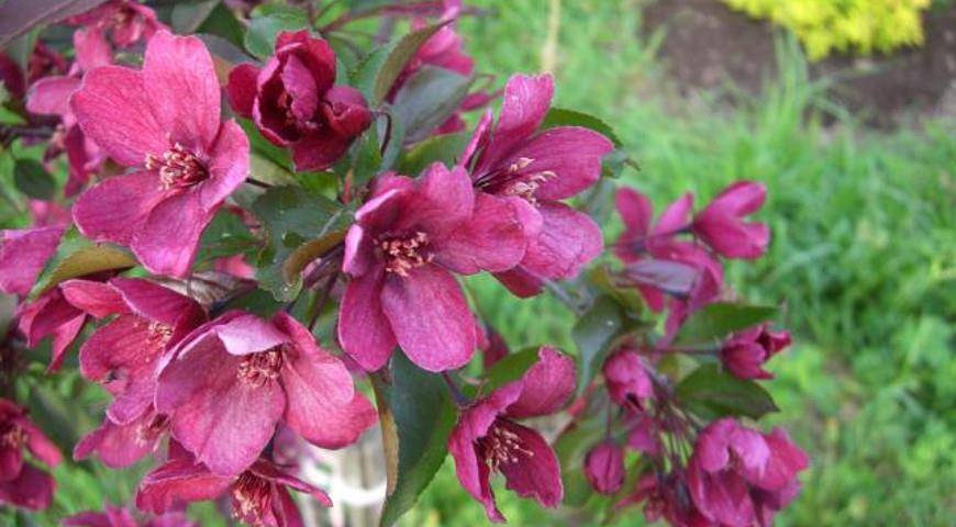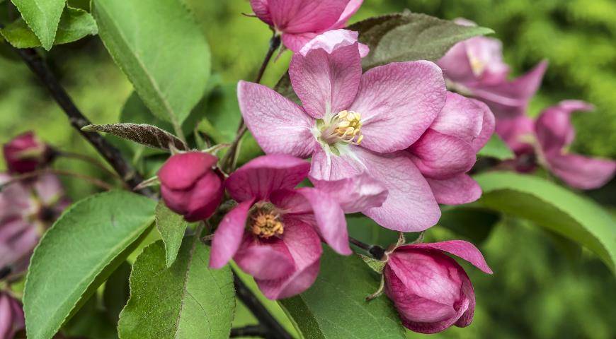 Бутоны пурпурные, цветки в роспуске насыщенного розового цвета. Плоды темно-красные, мелкие.