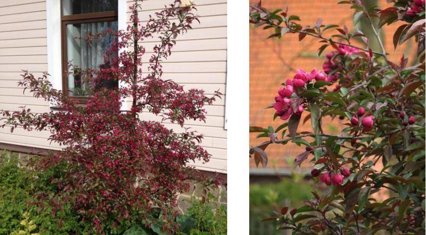 Яблоня высотой до 5 м, крона округлая. Листья при распускании красновато-бронзовые, взрослые – зеленые с бронзовым отливом. Цветки крупные, ярко-розовые, плоды пурпурные.