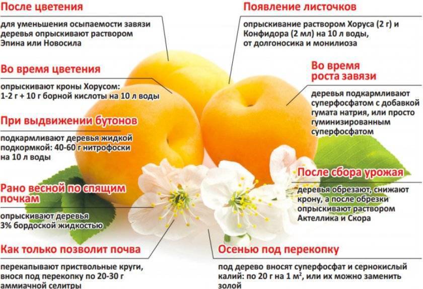 - ранней весной ежегодно проводятся подкормки абрикосовых деревьев качественными органическими удобрениями;