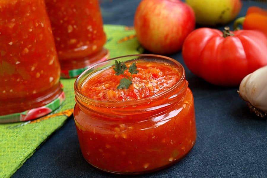 Для закатки выбирают только кислые сорта яблок. Помидоры, морковь, яблоки измельчают. Кипятят с солью, сахаром, чили, маслом и уксусом.