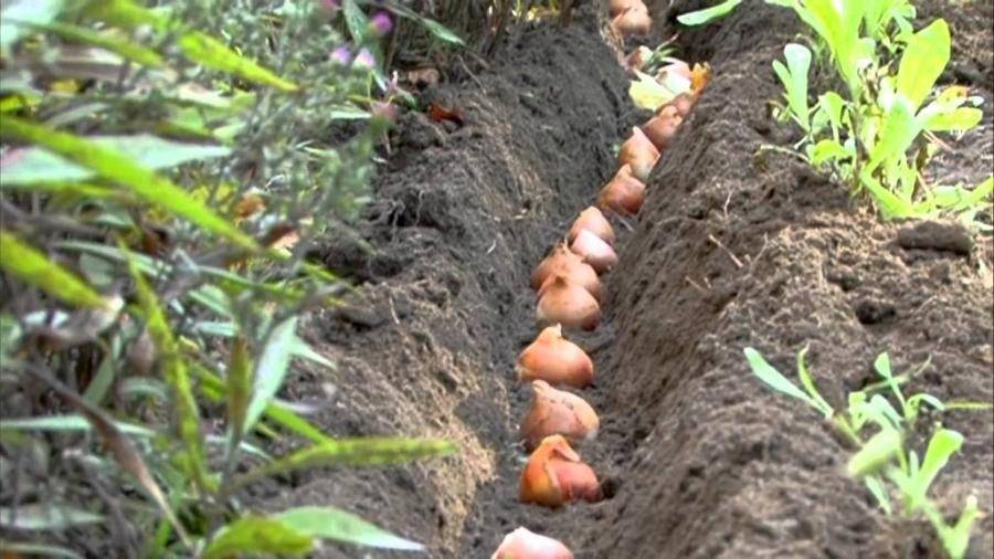 Для посадки в грунте выкапывается ямка глубиной не больше 15 сантиметров. Расстояние между ямками не должно быть меньше 10 сантиметров. В каждую ямку опускается по одной луковичке, после чего их засыпают слоем земли и поливают.