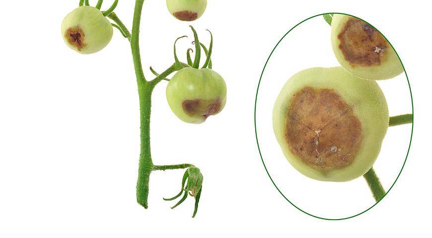 На листьях образуются крупные коричневые пятна, побеги загнивают. Плоды при повышенной влажности покрываются бурыми, увели
