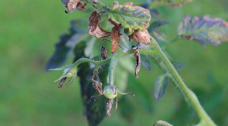 Одно из самых распространенных и опасных заболеваний. Массово поражает томаты в конце сезона, страдают все органы растения,