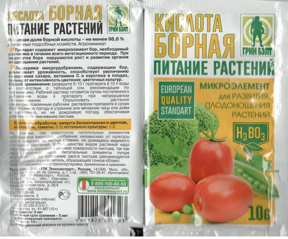 Борная кислота считается самым экономичным, доступным и простым в применении источником микроэлемента. Этот препарат содержит необходимую для роста культур форму вещества.