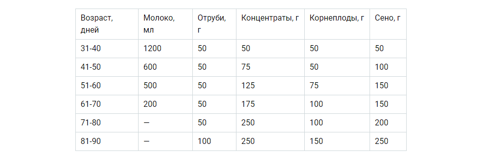 С первого по десятый день после рождения малышей кормят только молоком. Его дают 4 раза в сутки, начиная с 200 г в одно кормление, постепенно увеличивая объем до 300 г. С 11-го дня можно ввести 200 г овсянки в день, с 21-го — 30 г концентратов, еще через 10 дней — 40 г корнеплодов. В это время количество кормлений сокращают до трех. В 3 месяца суточное меню козленка должно выглядеть следующим образом: