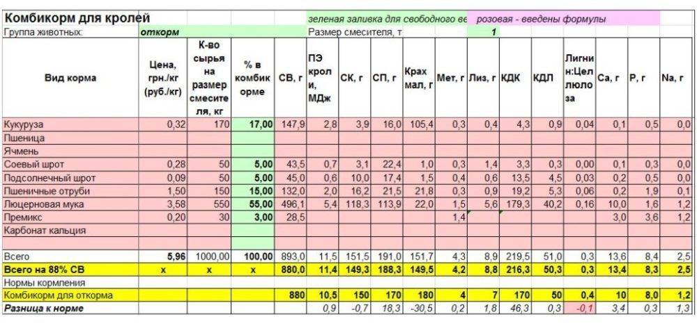 В летнее время, когда в рационе есть трава и свежие овощи, кроликам можно приготовить комбикорм из следующих ингредиентов: по 10% овса, дробленой кукурузы и макухи, 30-40% ячменя, остальное — пшеница.