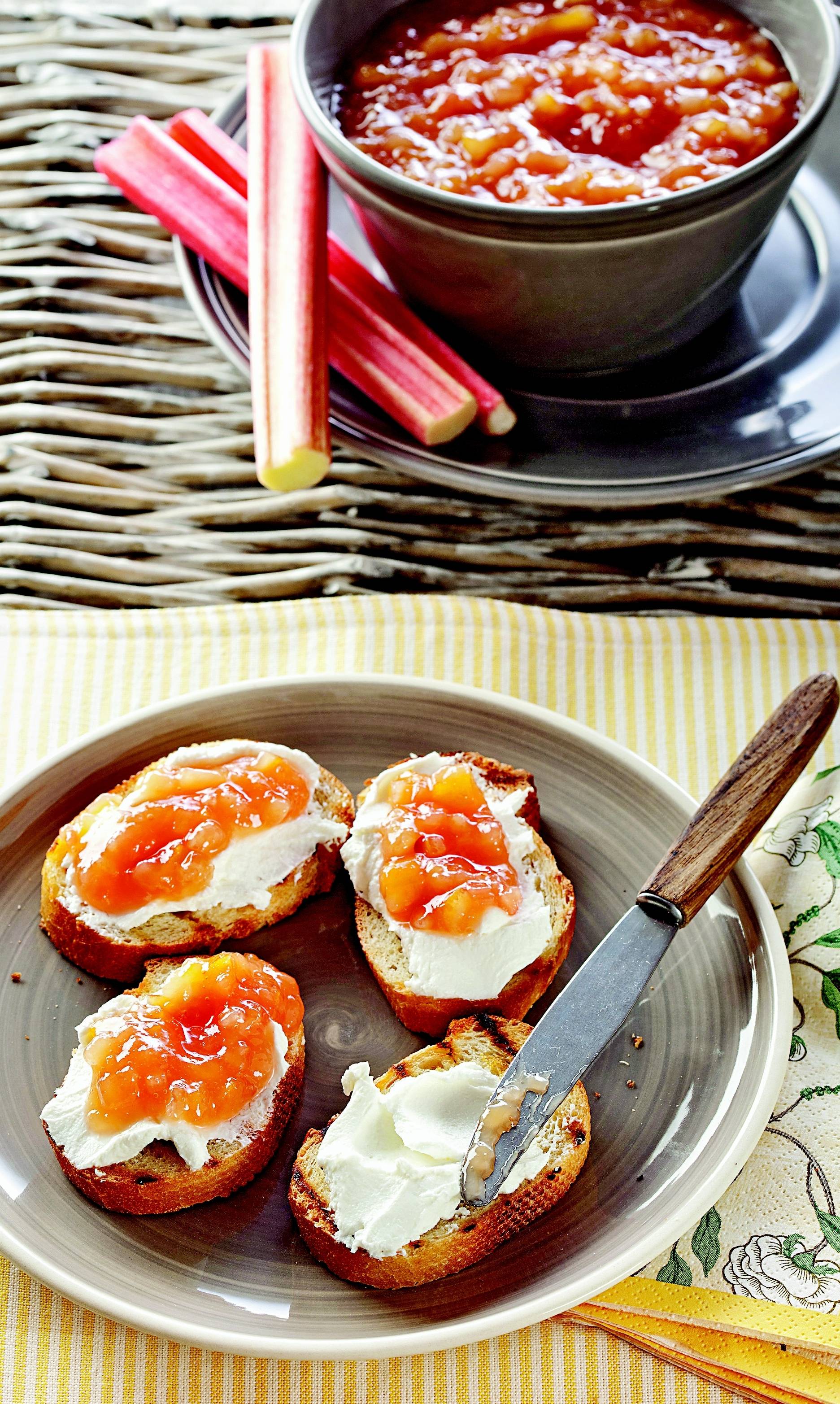 2 лимона100 г ревеня100 г тростникового сахара300 мл воды2 веточки базиликабагетсливочный или козий сыр