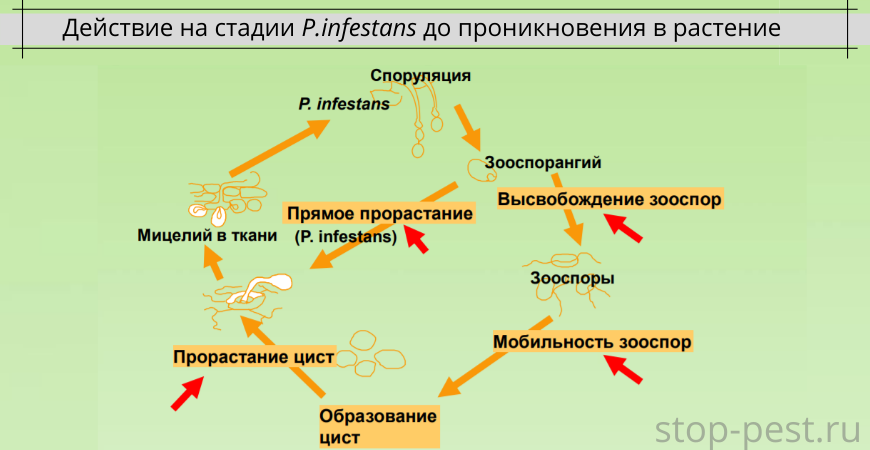 б) Фенамидон — обладает локально-системным и трансламинарным действием. Проникает во вновь образующиеся части растения, попадая в ткани пазушной почки, и впоследствии перемещается вместе с развивающимися тканями растений. Блокирует митохондриальное дыхание (QoI) во всех стадиях жизненного цикла патогена (высвобождение зооспор, прямое прорастание цист и пр.)