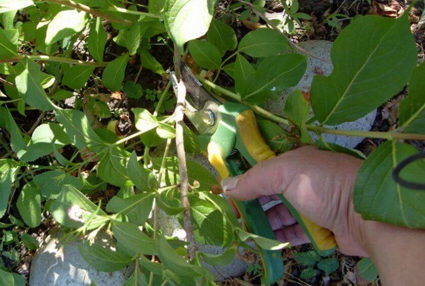 Удаление ветвей кустарника проводят в октябре или ноябре, после того, как почернеют листья. Обрезанное в это время растение намного проще закрыть на зиму