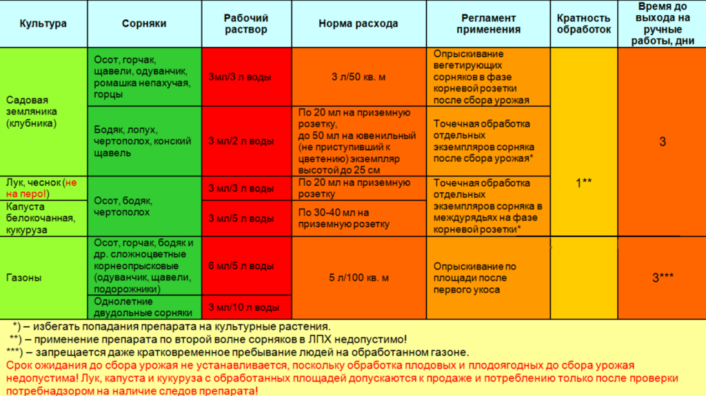 | Газон | 0,18 | Обработка проходит спустя 4 дня после покоса с мая по июнь либо с августа по сентябрь |