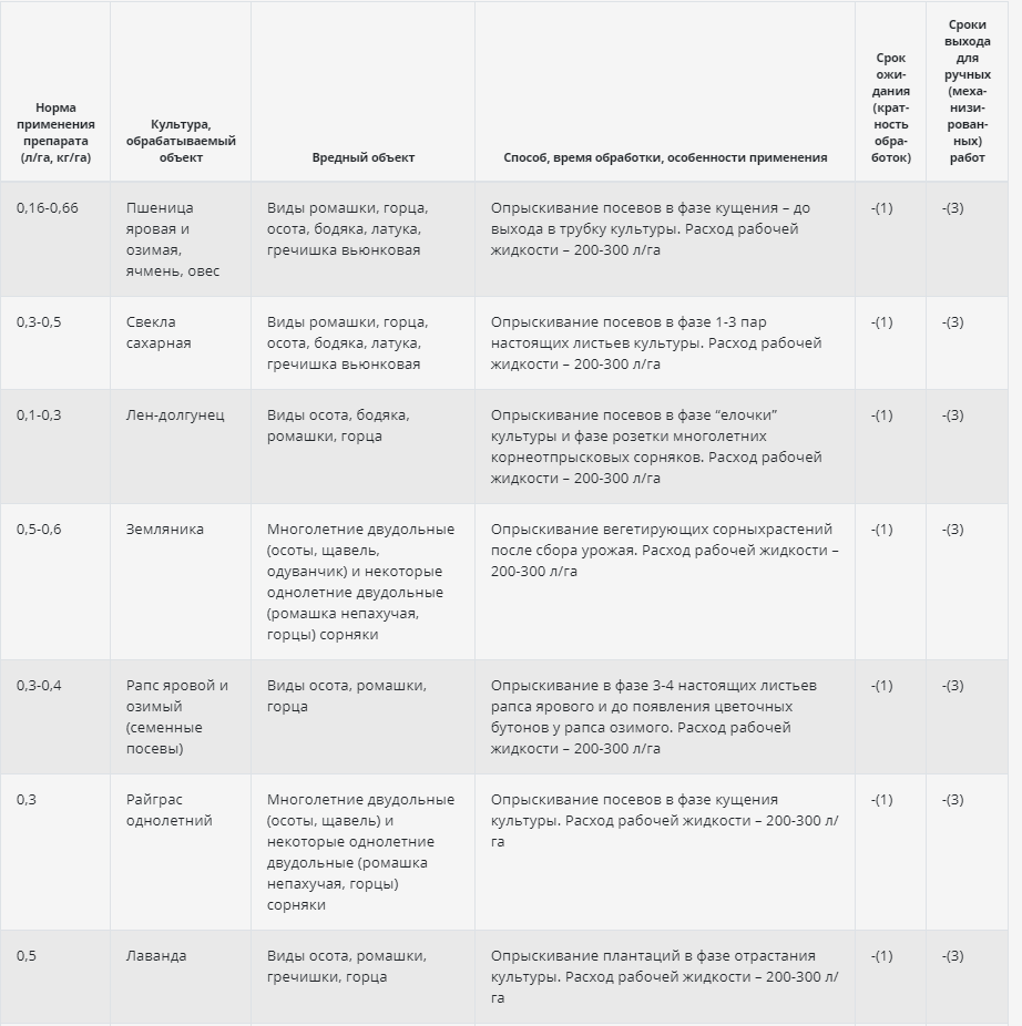 Норма внесения зависит от видового состава сорняков на время использования (на полях, засоренных пыреем ползучим и гумаем, следует применить рекомендованную дозу гербицида).