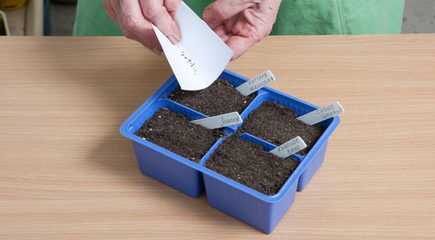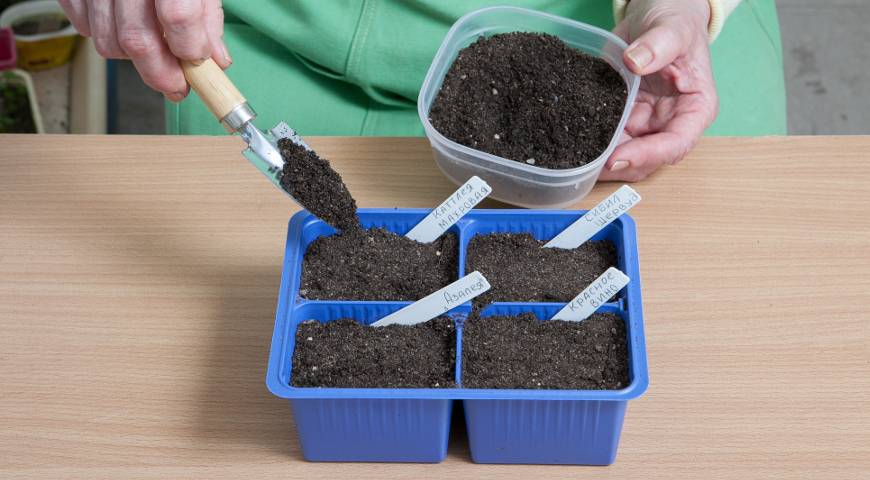 1. Контейнеры наполняют грунтом, который нужно уплотнить и равномерно увлажнить. Для равномерного посева семена желательно смешать с мелким песком, а затем равномерно рассыпать по поверхности почвы, не заделывая.