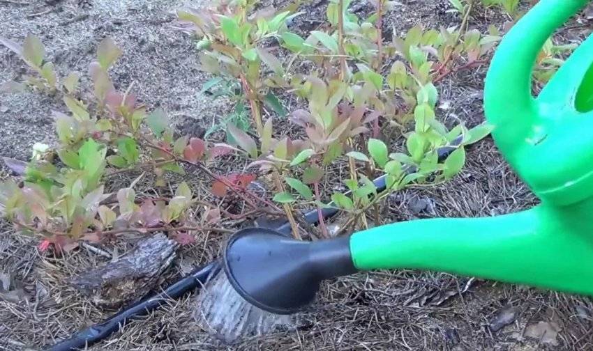 Помимо полива прикорневого круга, в наиболее жаркие и засушливые дни следует дополнительно опрыскивать листву тёплой водой. Делать это надо вечером, чтобы прямые солнечные лучи не обожгли растение. Особенно сильно голубика нуждается в воде во время созревания ягод. При этом нельзя допускать избыточного полива с застаиванием лишней влаги, поскольку это может привести к загниванию корней.