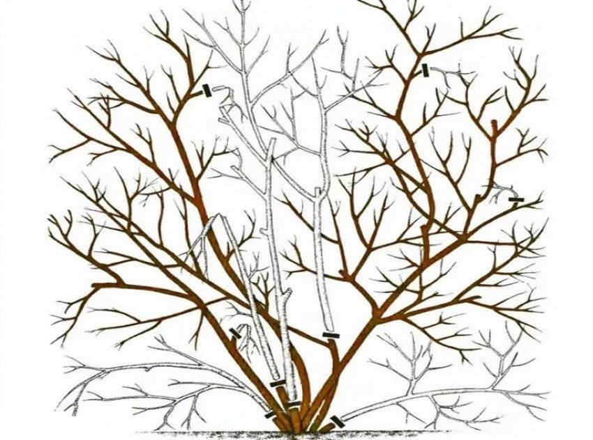 Первую обрезку производят на третий год после высадки саженца в грунт, формируя мощные осевые побеги и пряморастущие скелетные ветви. Для этого удаляют все мелкие побеги (высотой до 35–40 см) нижних ярусов куста. В дальнейшем весной до распускания почек обрезают все слабые ветки возле корневой шейки, побеги, растущие внутрь куста и под углом 45о в сторону междурядья. На 5–6 год опытные садоводы советуют сделать омолаживающую обрезку, вырезая все старые ветви и оставляя 3–4 новых скелетных побега.
