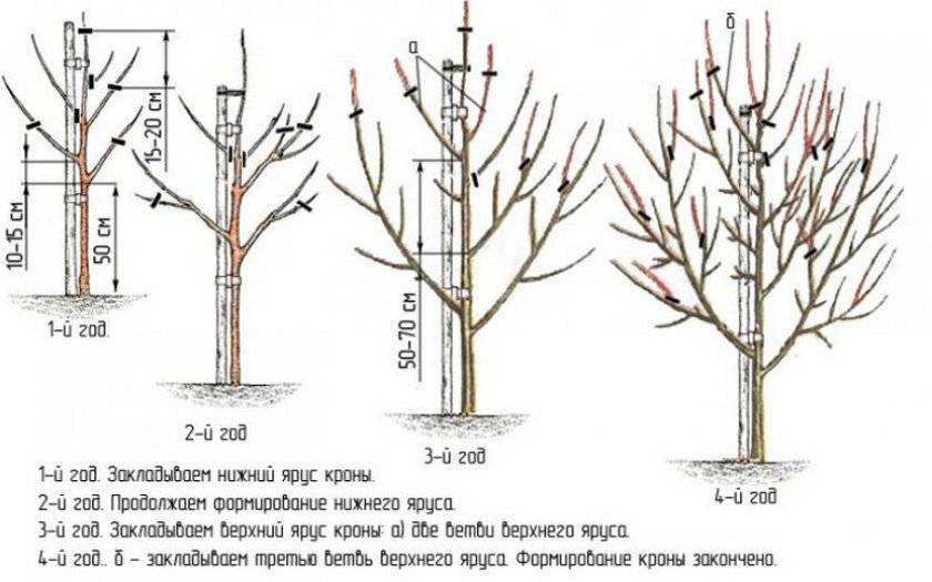 Формирование груши проводится на протяжении 5–6 лет с момента посадки. В этот период на дереве вырастают основные побеги, на которых в дальнейшем появляются плодовые ветви.
