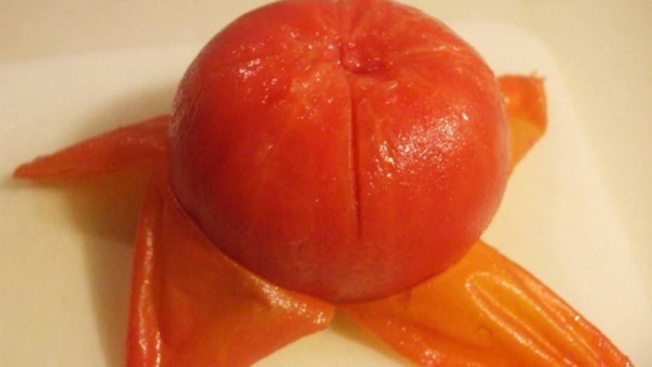- Помидоры отделить от кожуры, ошпарив кипятком, порезать квадратиками. Перцы освободить от семян, перепонок, плодоножек, сполоснуть и порезать соломкой.