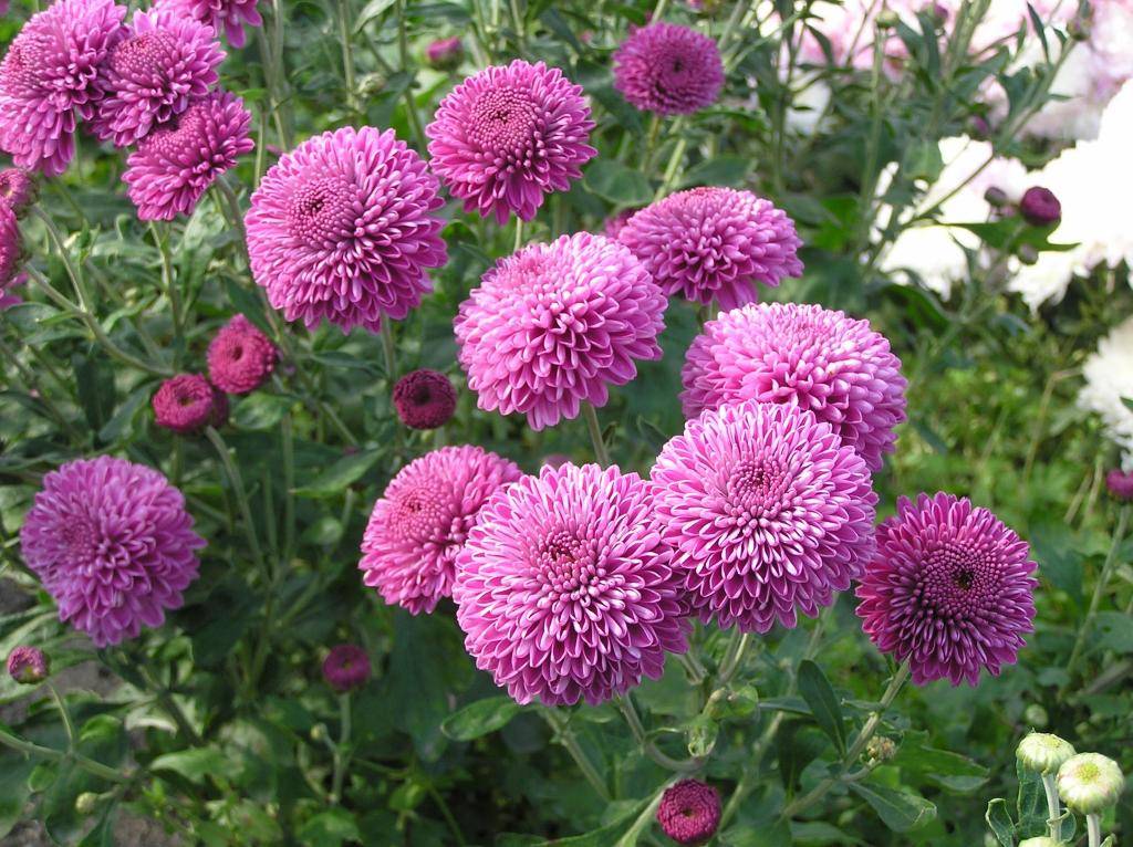 Для оформления участка рекомендуется выбирать низкорослые сорта с мелкими цветками. Это могут быть корейские сорта, шаровидные, другие виды. Правильно подобранные растения будут украшать сад с июля и до поздних заморозков. Если регулярно удалять отцветшие бутоны, то можно продлить цветение до четырех месяцев.