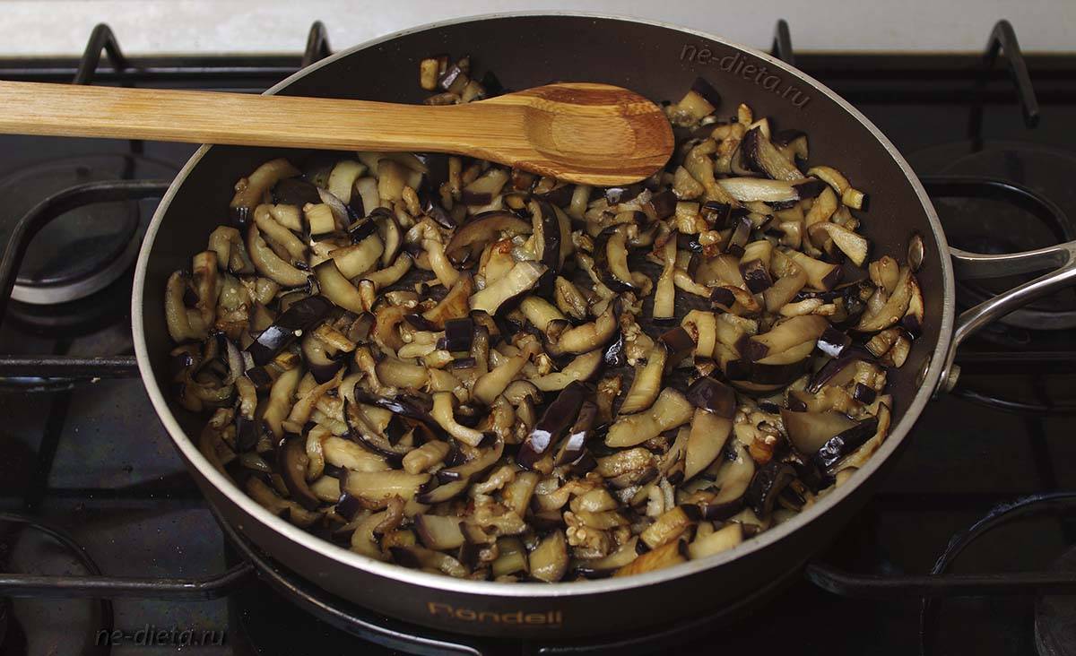 - Вымытые синенькие порезать кольцами. На сковороде обжарить, сложить в кастрюлю.