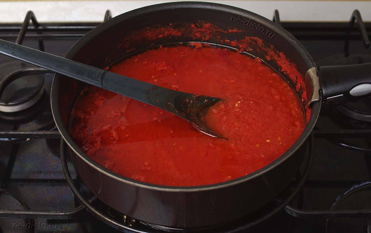 8. В глубоком сотейнике разогреть оставшиеся 200 мл подсолнечного масла, выложить измельченные помидоры и уваривать их на маленьком огне при небольшом кипении в течение 15 – 20 минут.