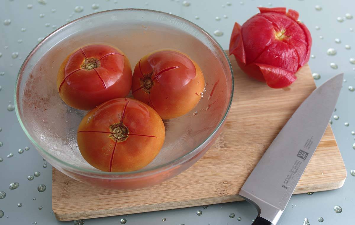 - Томаты, вымыть, сделать на них надрезы, положить в миску, облить кипящей жидкостью, оставить на несколько минут. Это позволит легко снять шкурку.