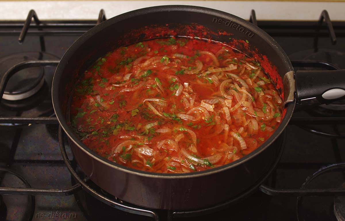 - Помидоры и зелень измельчить блендером. Добавить соль, сахар и специи, проварить 5 минут.