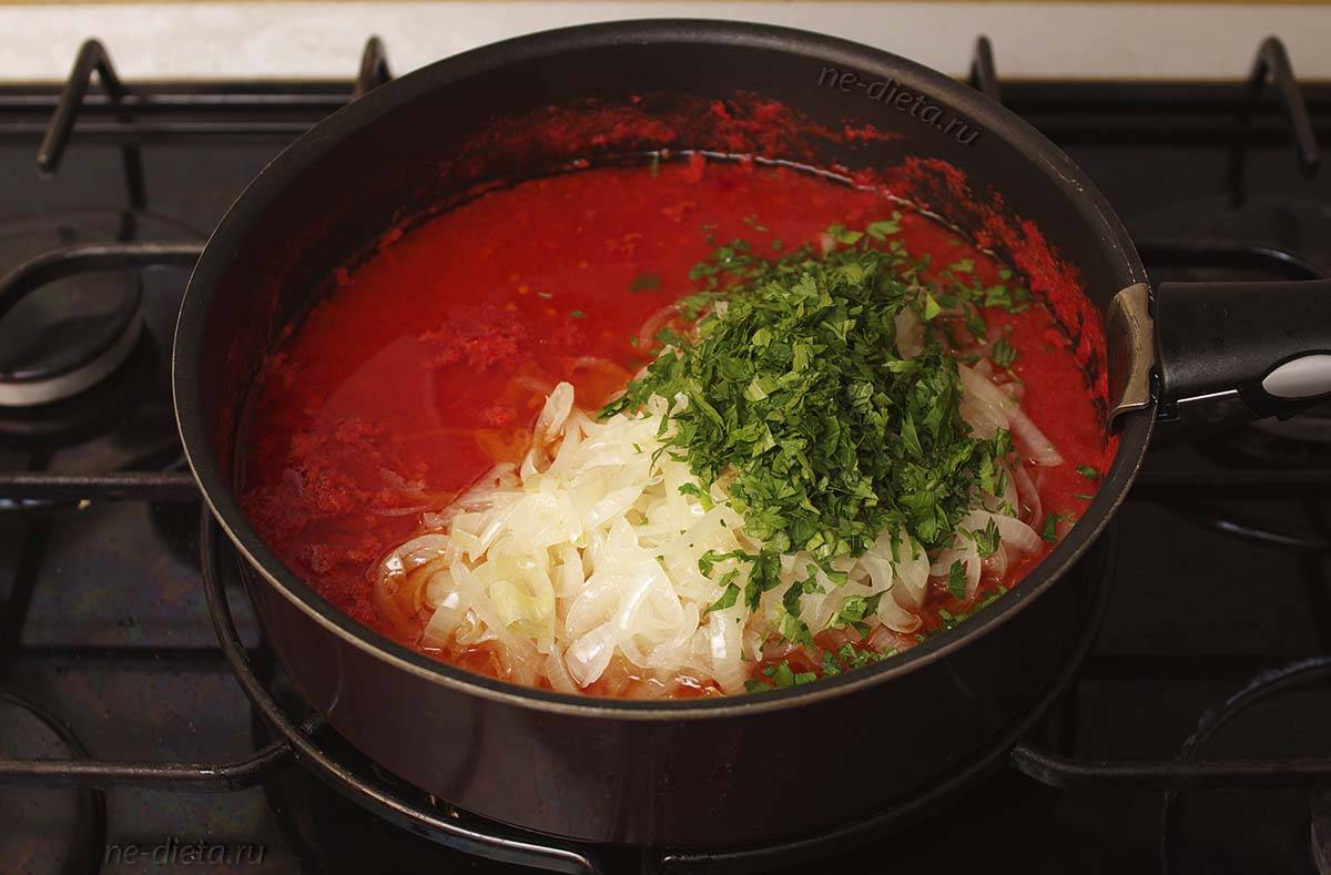 9. К помидорам добавить обжаренный лук, измельченную петрушку и соль, готовить еще 10 – 15 минут.