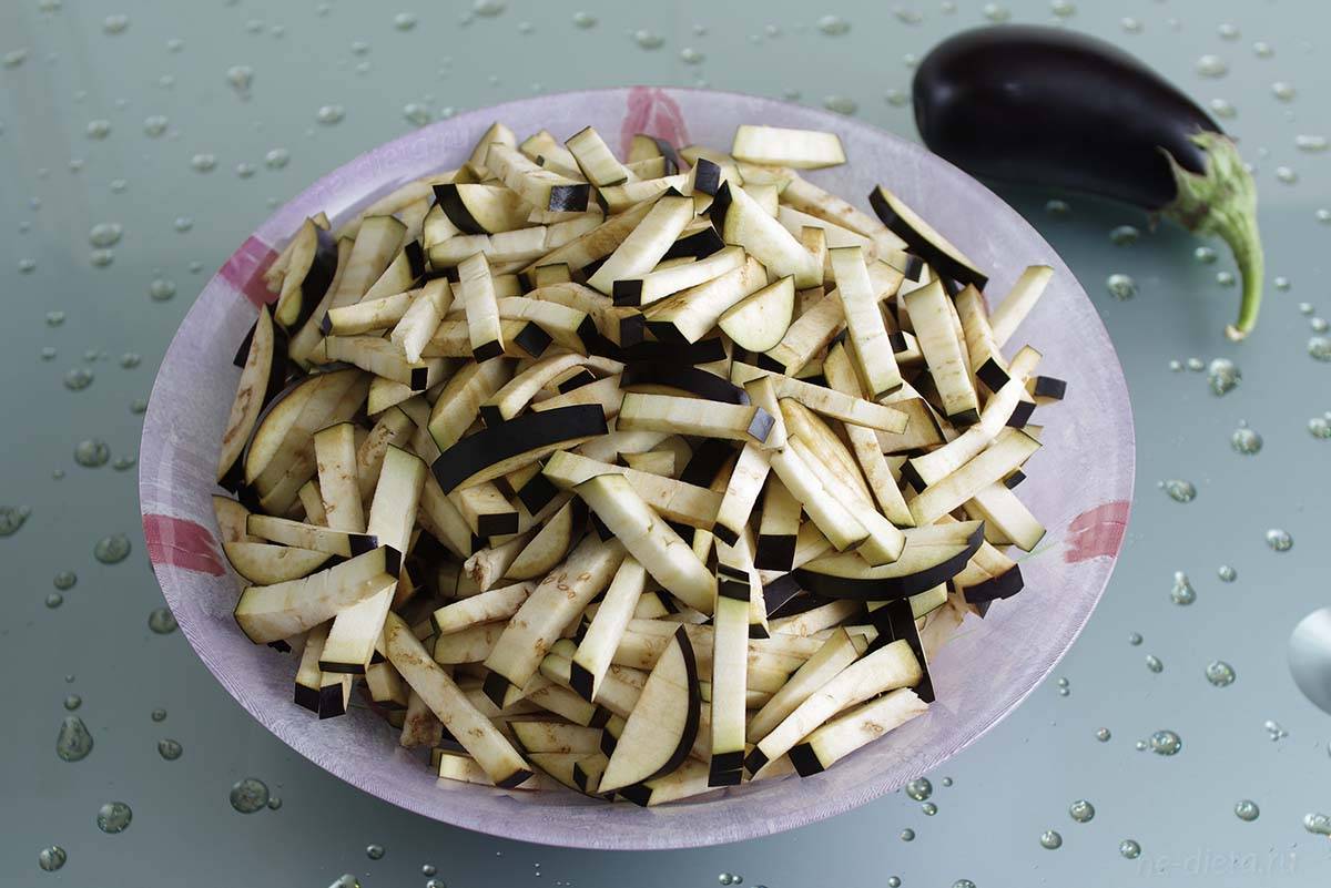 - У чистых баклажанов удалить плодоножку с небольшим слоем мякоти. Срезать кожуру полосками (примерно 1 см).
