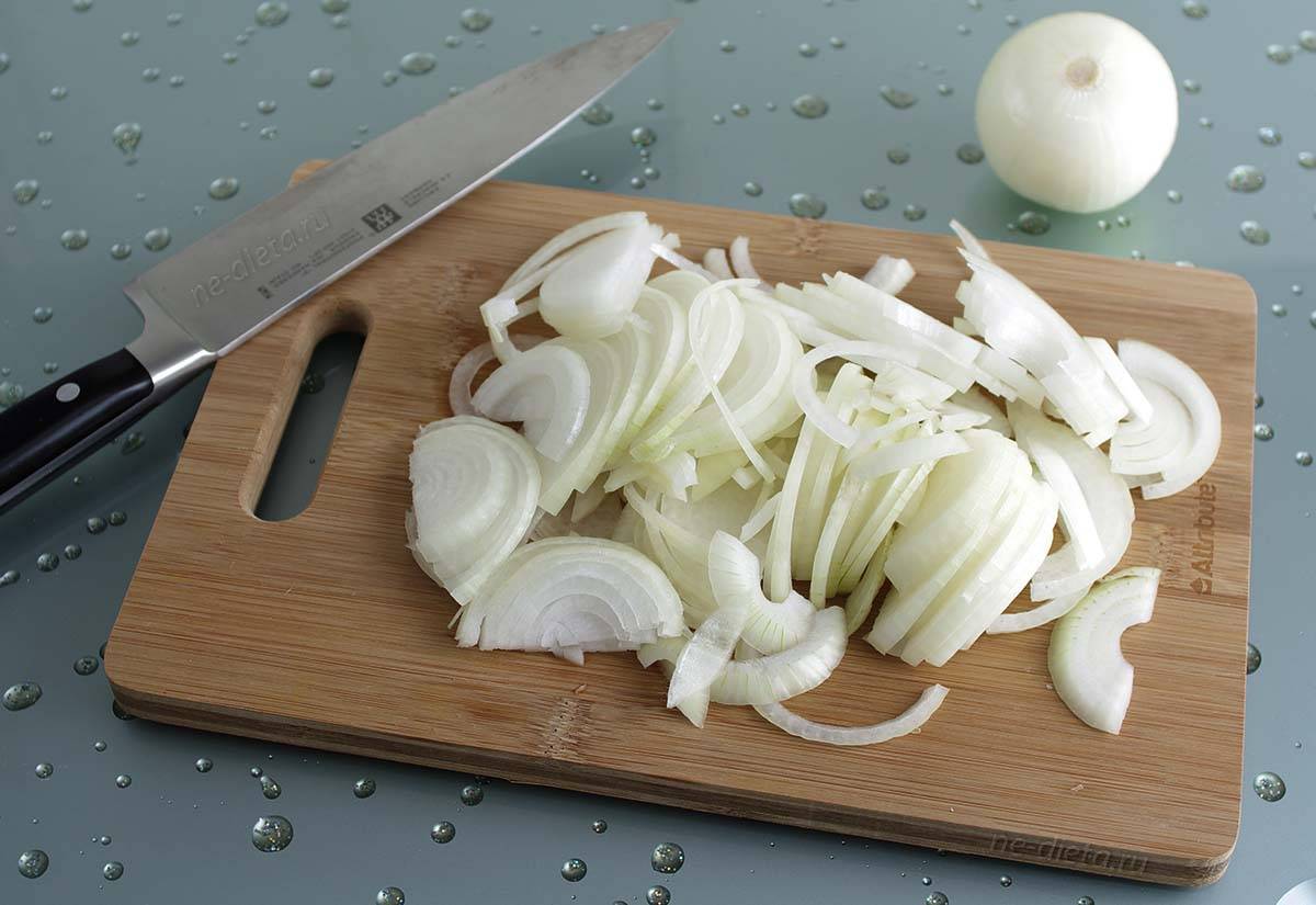 - Очистить лук, прорезать по желанию: соломкой или кубиками. Пассировать в масле.