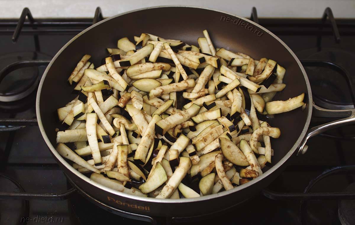 3. Растительное масло наливаем на сковородку. Разогреваем на среднем огне. Затем обжариваем баклажаны партиями. Каждый кусочек с обеих сторон. Баклажаны должны как следует подрумянится.