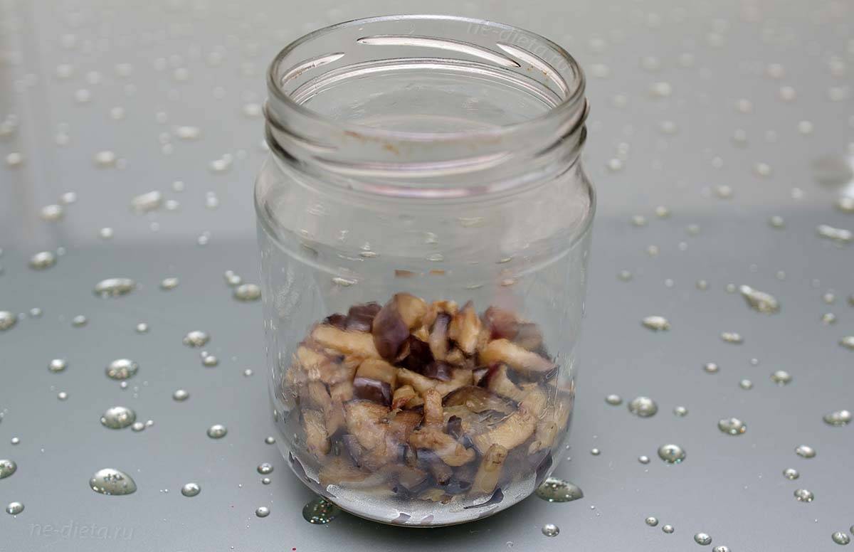 11. На дно стеклянной банки выложить слой жареных баклажанов толщиной в 1.5 — 2 см.