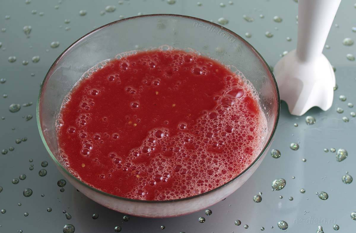 - Томаты бланшировать, снять шкурку, измельчить блендером. Проварить четверть часа.