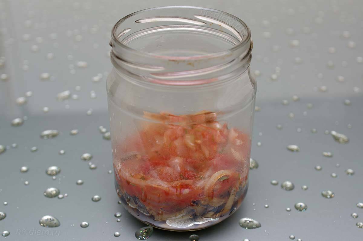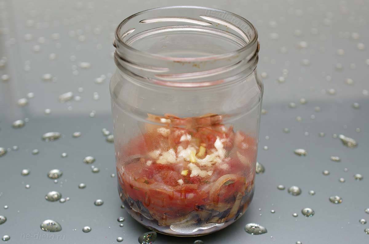 - Баклажаны разложить в подготовленные емкости слоями, заливая полученным соусом.