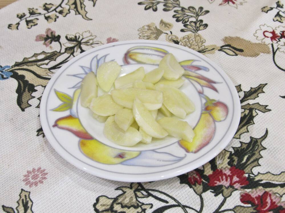 - Чесночные зубки очищаем и нарезаем пластинками. Можно оставить и целиком.