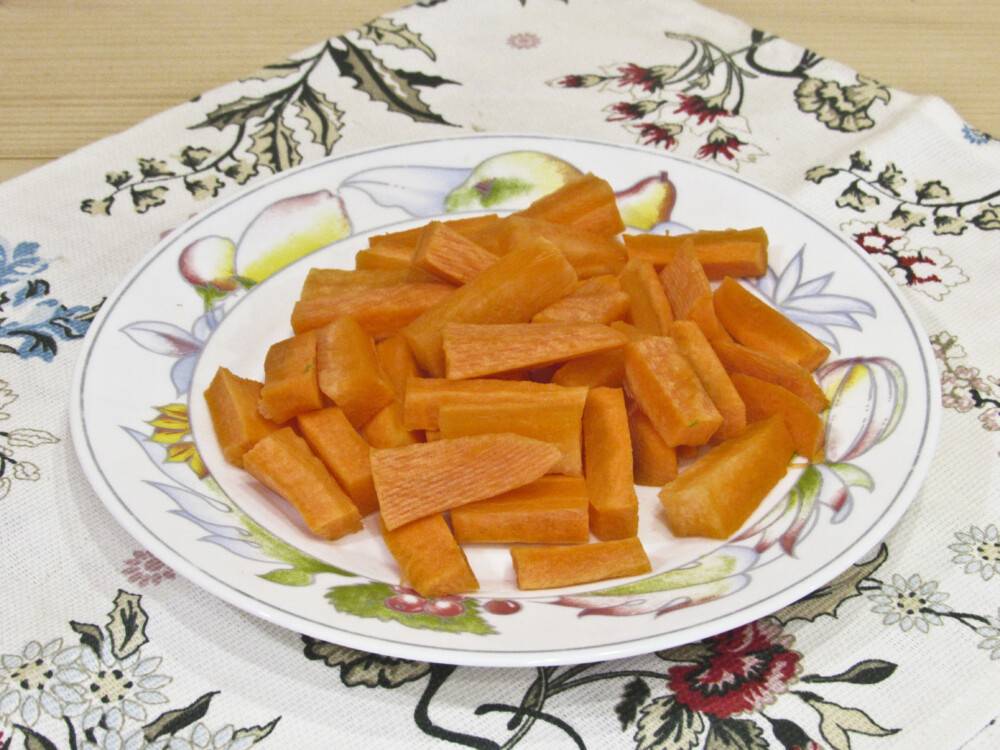 - Морковь очищаем, ополаскиваем и нарезаем брусочками средней толщины. Форма нарезанного овоща может быть разной, по вашему желанию: кружочки, средняя соломка, половинками кружков.