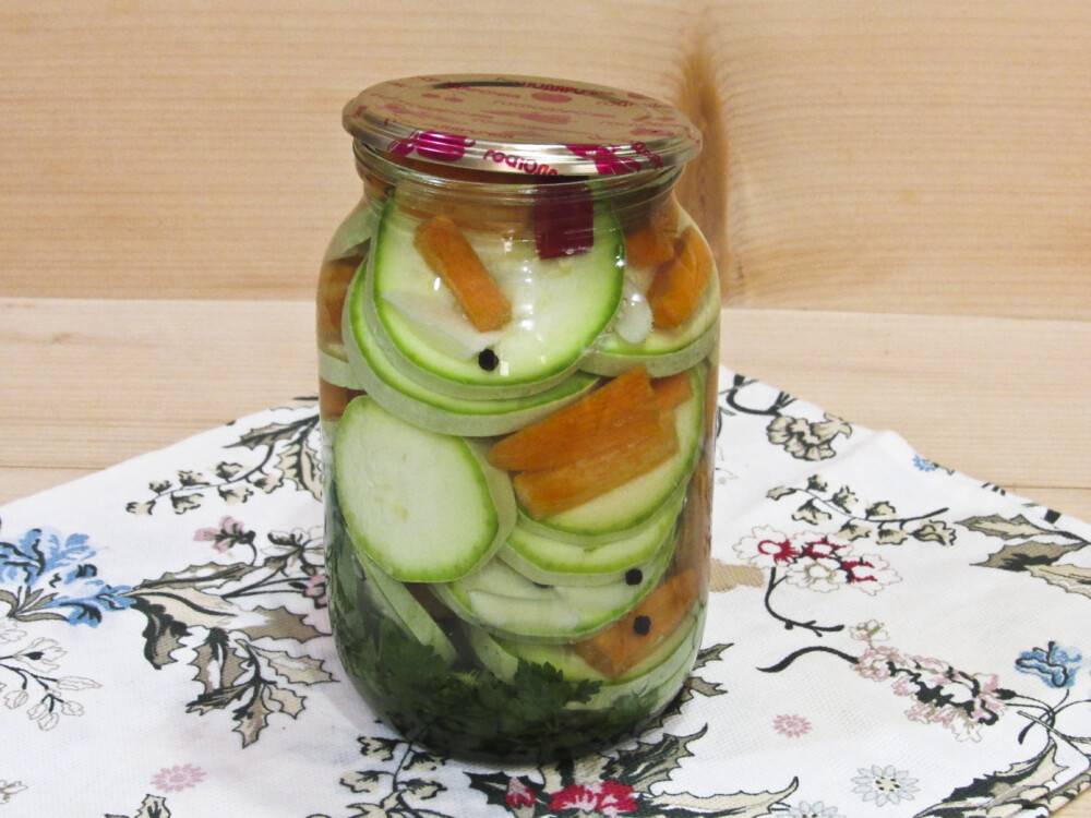 - Приготовить закуску без стерилизации дает возможность предварительная термическая обработка входящих в ее состав овощей. Кабачки бланшируют в кипящем маринаде в течение 5–7 минут или тушат с другими овощами в течение 20–30 минут.
