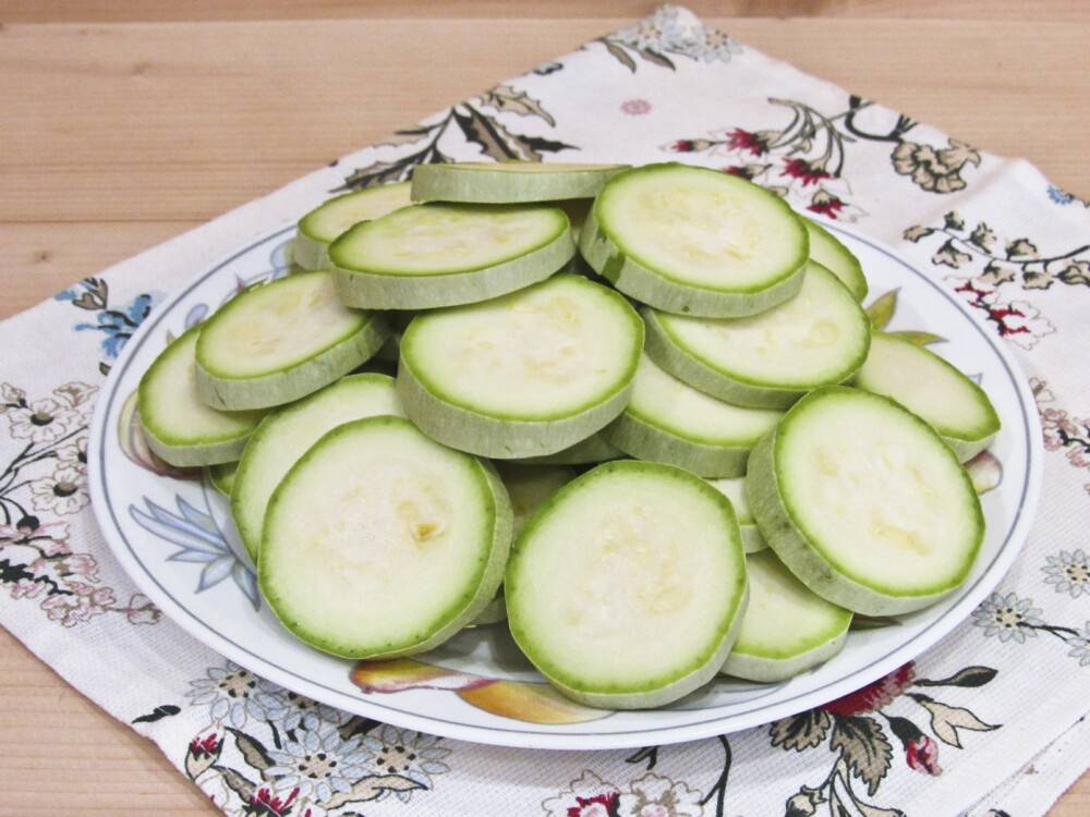 Нарезаем слайсами толщиной примерно по 1 см. Срезать кожуру не надо, так как цукини молоденькие.
