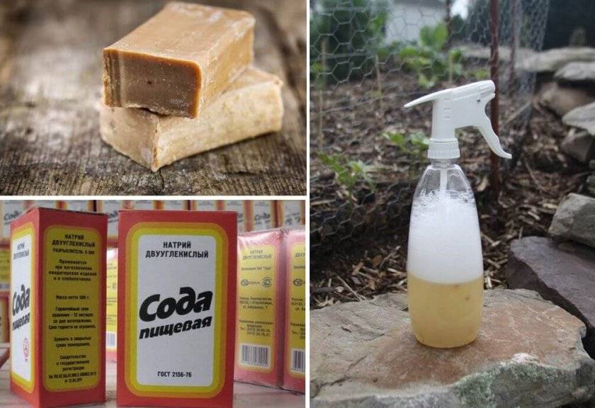 - Мыло+сода. В литре тёплой воды растворить ¼ куска хозяйственного мыла, натёртого на тёрке. Подмешать 1 ст. л. кальцинированной соды. Опрыскать растение.