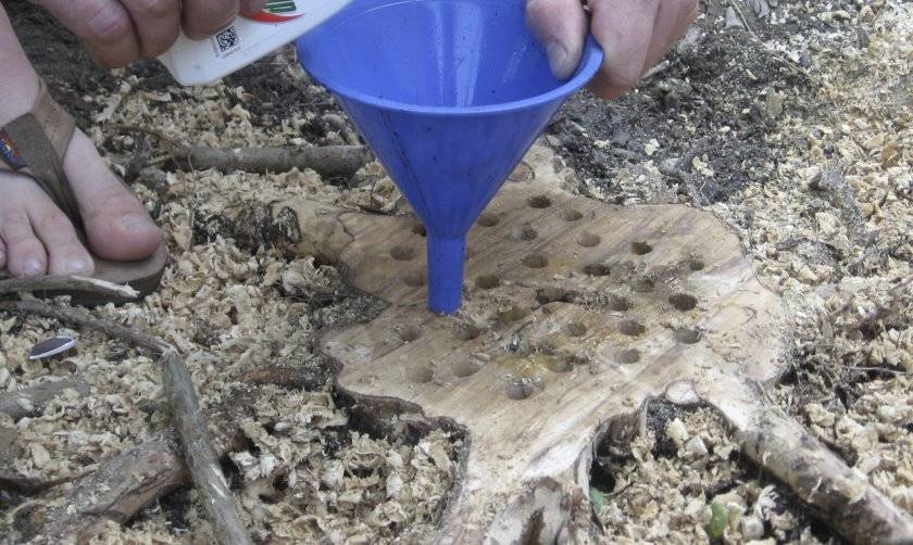 Дерево спиливается на 50-60 см от земли. В нескольких местах просверливаются отверстия, в которые вливаются химикаты (арборициды). Верх спила накрывается пленкой или чем-то похожим на крышку. Через 7-8 дней просверливают еще несколько отверстий и вливают те же препараты. Процедура повторяется 2-3 раза каждые 10 дней.