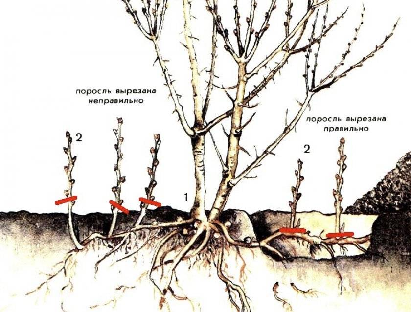 - Обрезка поросли (если каждый год просто обрезать отростки, меньше их становиться не будет, нужно выкапывать их вместе с корневой системой).