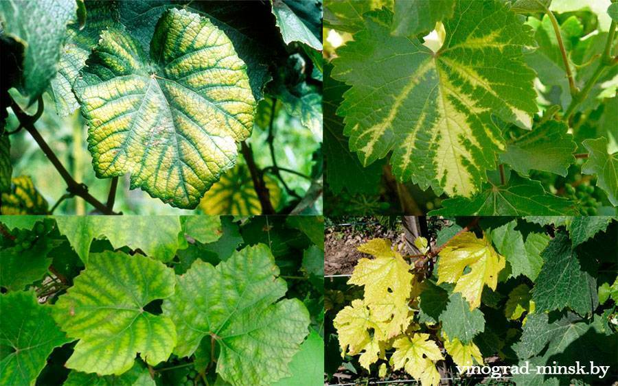 Хлороз (желтуха винограда) вызывает пожелтение листьев, и только вдоль главных жилок остаются зеленые участки. При сильном развитии хлороза желтая окраска переходит в бурую, листья начинают усыхать и опадать. Рост побегов ослабевает, междоузлия становятся короткими, и кусты часто погибают.