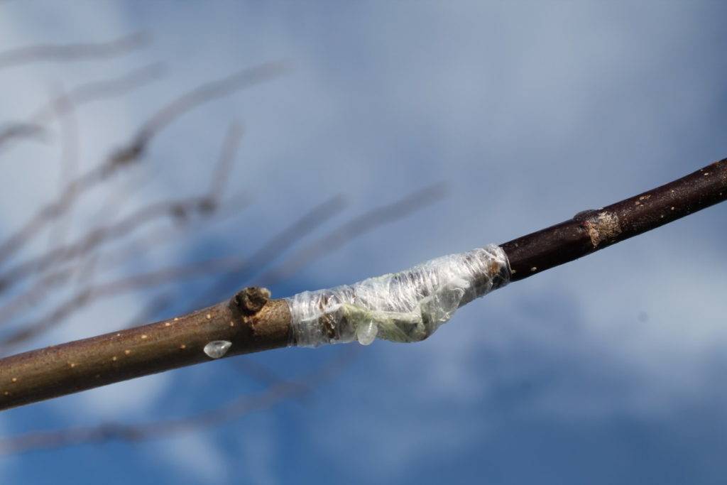 Место приживления нужно плотно примотать изолентой ПВХ, захватывая при этом здоровую кору ствола по верхней и нижней части не менее чем на 5 см.