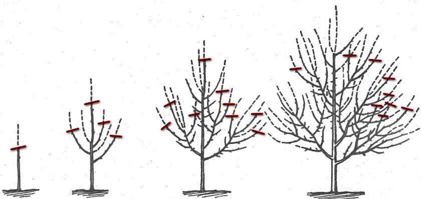 Обрезку необходимо делать непосредственно после высадки растения в почву. Это обеспечивает корневую систему питательными и минеральными веществами. Обычно активны 4 ветви, которые в будущем составят скелет дерева. Для посадки используют одно-двух-трехлетние саженцы. Наиболее крепкий иммунитет у трехлетки. Деревья одно и двух лет требуют более щадящей формировки.