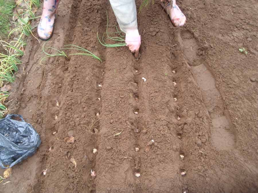 Для посадки бульбочками можно прокопать канавки глубиной 3-5 см и в них разложить посадочный материал. Расстояние между бульбочками 2-3 см, между рядками — 10-12 см.