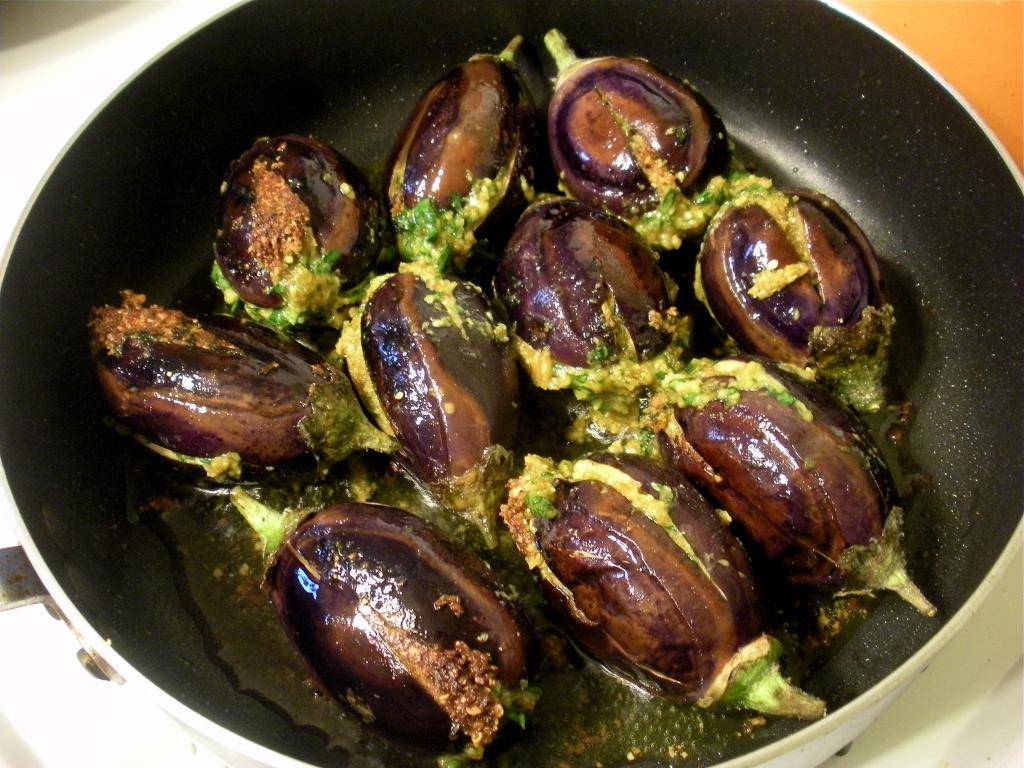 Для приготовления этой особенной закуски надо взять 5 кг небольших баклажанов и, залив их кипящей водой, варить на среднем огне в течение 3-5 минут. После этого воду надо слить и, остудив плоды, надрезать каждый из них на 3/4. В каждый овощ надо заложить приготовленный овощной фарш. Наполненные баклажаны нужно выложить на плоскую посуду, накрыть чистой марлей и установить гнет поверх них. Через три дня баклажаны надо разложить по стерилизованным банкам, залить небольшим количество раскаленного растительного масла и закатать под железные крышки.