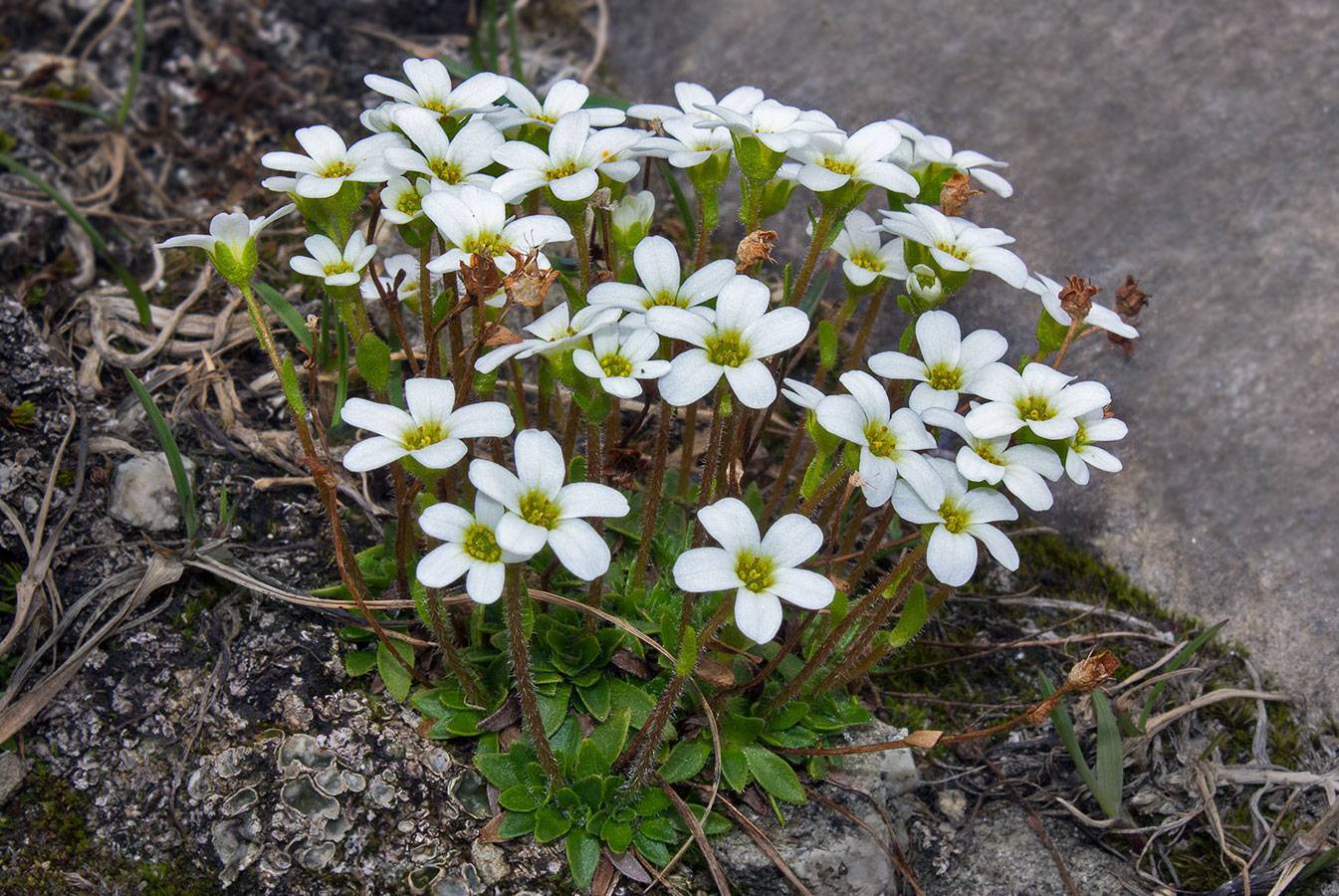 - Камнеломка снежная растет преимущественно в Арктике. Высота растения около 20 см. Листья зелено-красного оттенка. Цветки белые, мелкие, собраны в крупные шаровидные соцветия. Стебель одиночный, листья на нем не растут. Период цветения в середине лета.