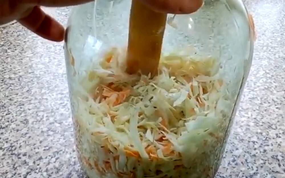 Смотрите, положили небольшое количество капусты, и хорошенько утрамбовали. Следом морковку, с ней поступаем аналогично. Таким образом мы сможем вместить овощей гораздо больше.
