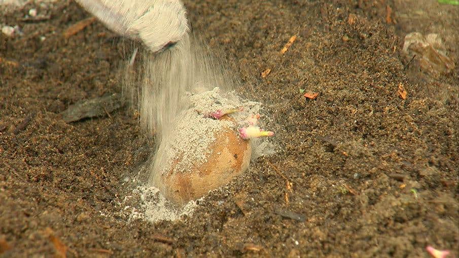 - Первый раз картошку подкармливают, когда сажают, засыпая в лунки золу и органику.